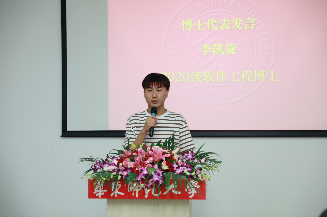 2020级博士研究生代表李凯旋同样以崭新的身份从这里出发。他认为作为新时代民族复兴中坚力量的软工人,应当努力做到三点:确立目标,肩负使命,“为增长知识和才干走进来,为服务祖国和同胞走出去”;脚踏实地,求真务实,耐得住寂寞,经得起诱惑;敢于尝试,砥砺前行,成为时代河流中奋勇前进的搏击者。