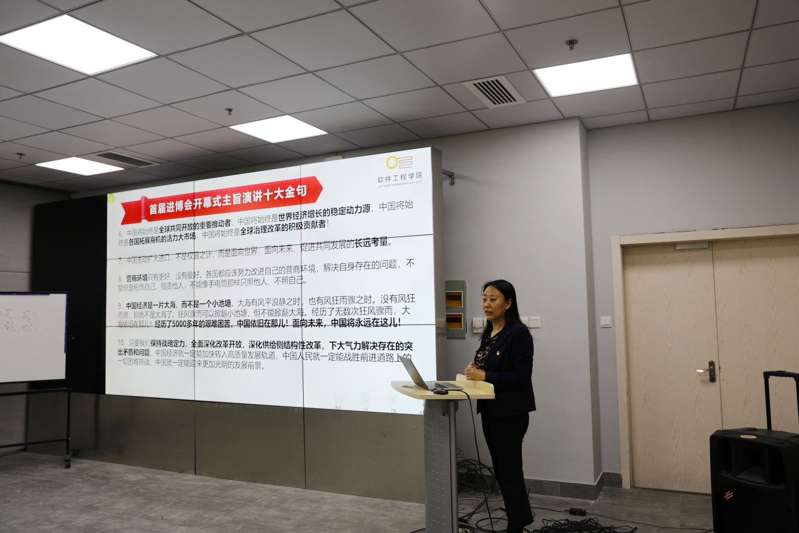 学院党委副书记曹桂涛带领党员同志们学习了习近平总书记在历届中国国际进口博览会上的主旨演讲,分享了前两届进博会开幕式主旨演讲十大金句,并回顾了第二届进博会开幕式主旨演讲要点。她鼓励同志们要积极发挥主观能动性,坚定信念,深刻理解中国共产党人“为中国人民谋幸福,为中华民族谋复兴”的初心和使命。