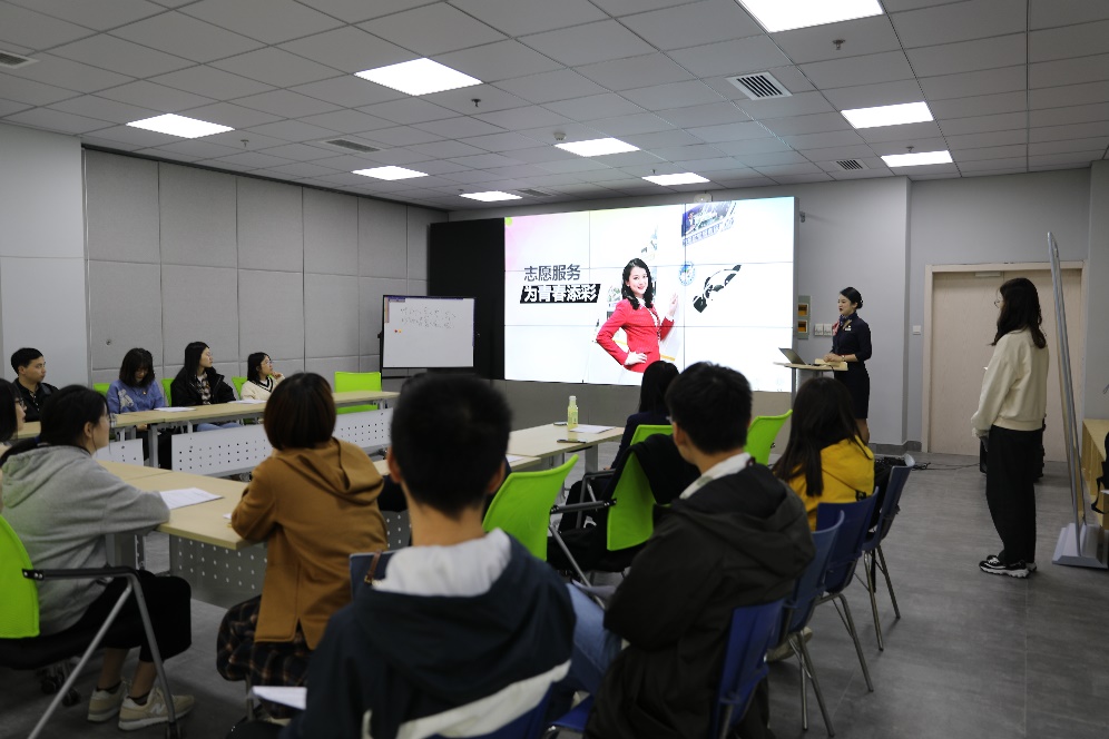 中国东方航空集团有限公司乘务员邓闻仪分享担任第二届进博会长期管理岗位志愿者的经历。“志愿精神是青春梦想前行的动力”,她鼓励同学们要积极参与志愿活动,为青春添彩。