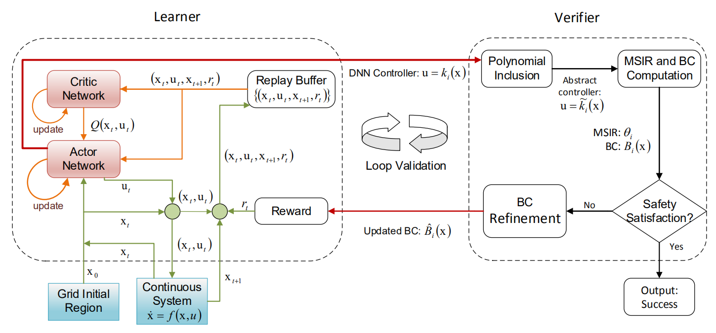 针对面向安全攸关系统的人工智能系统,如何构建安全的AI组件已引起了可信人工智能领域的极大关注。杨争峰与其合作者首次提出了基于多项式优化的安全学习迭代框架,以动态更新的迭代方式同时生成障碍函数和DNN形式系统组件,从而保证闭环控制系统在无穷时间域上的安全性。迭代框架中的Learner运用深度强化学习训练DNN型控制器,较监督学习方法有更好的数据采样效率,Verifier则基于多项式抽象和双线性矩阵不等式求解计算最大安全初始区域及相应的障碍函数。该方法在构造精度和验证效率上都处于国际领先水平。