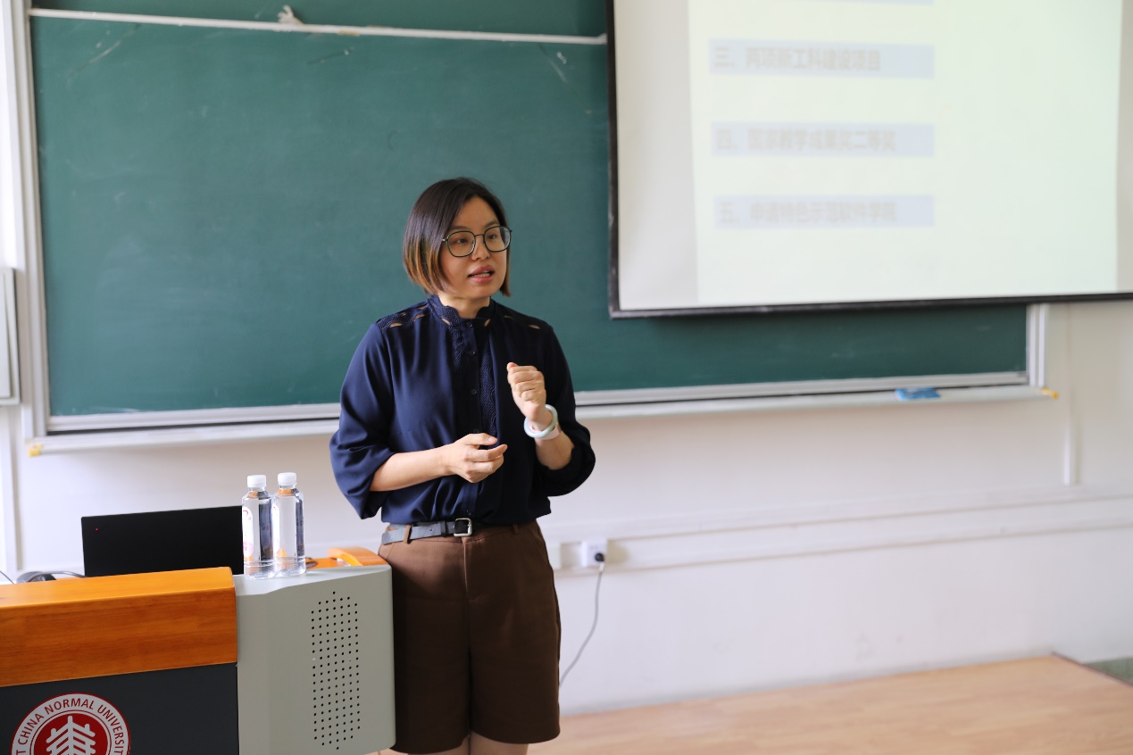 学院副院长张敏汇报本科教学工作。她从学院本科专业的现状、面临的挑战和改革方向出发,鼓励教师们能够积极参与到卓越育人的建设中来。