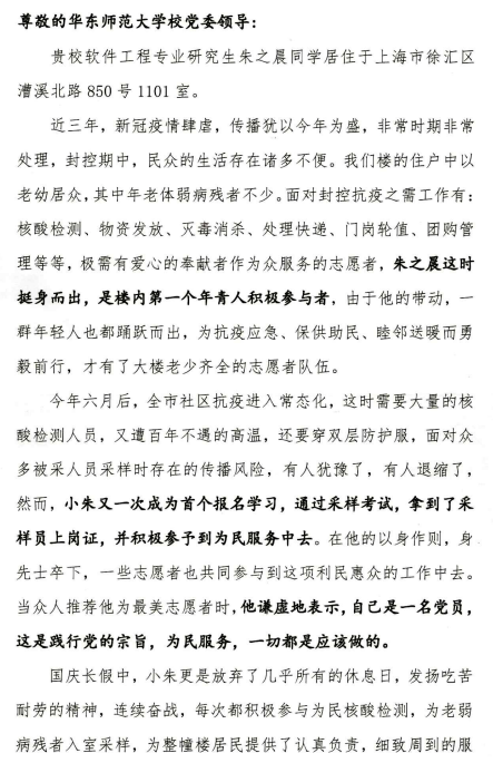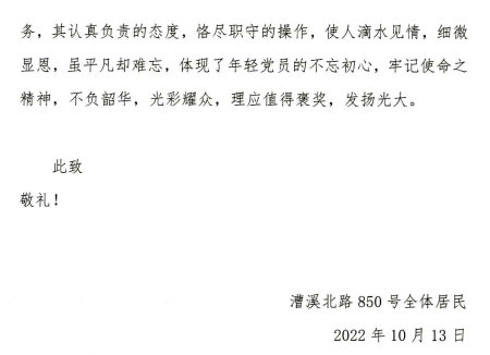 近日,bat365在线平台官网党委收到了来自上海市徐汇区漕溪北路850号全体居民的一封信,以感谢bat365中文官网入口2022级软件工程专业学位研究生党员朱之晨在疫情期间为社区防疫工作做出的不懈努力!