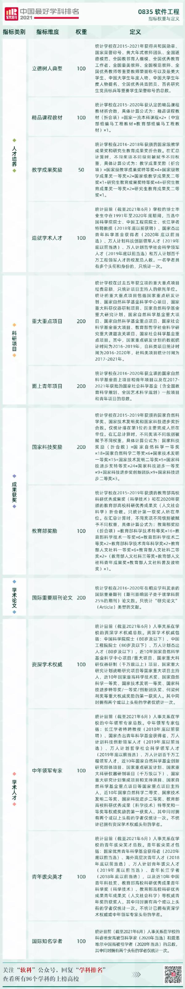 软科中国最好学科排名的指标体系包括人才培养、科研项目、成果获奖、学术论文、学术人才五个指标类别,下设17个指标维度,共计50余项反映学科竞争力的客观量化指标,涉及百余项观测变量。由于部分指标在不同学科门类的适用性和重要性存在差别,因此中国最好学科排名在不同学科采用差异化的指标体系。软件工程学科的指标权重与定义如下:
